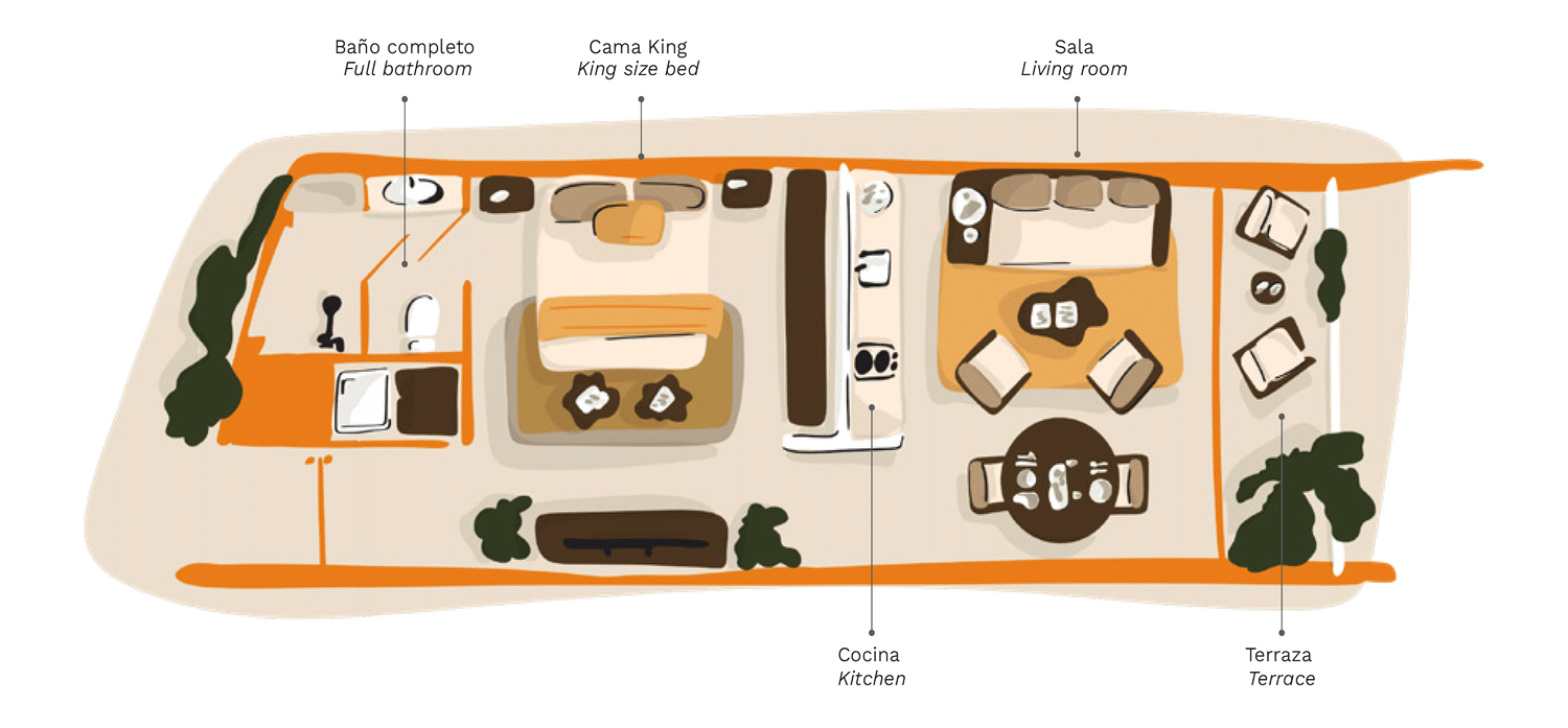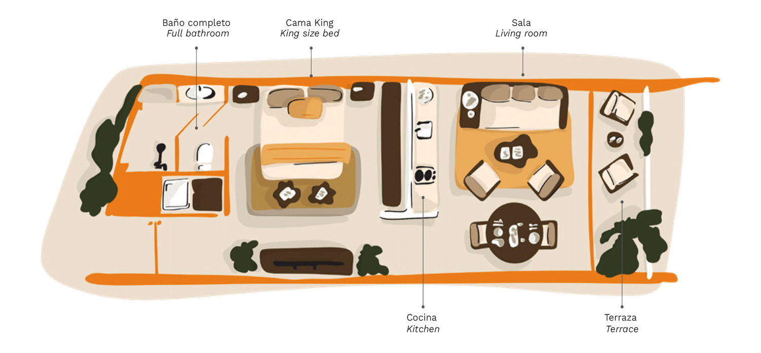 Spacious and thoughtfully designed, these twin units share the same generous layout: a bedroom with a king bed, a full bathroom, a welcoming living room, a fully equipped kitchen, and a private terrace. With travertine marble floors, white quartz chukum walls, and refined wood accents, their architecture blends timeless aesthetics with comfort. Surrounded by lush greenery, these ground-floor apartments provide a serene retreat ideal for couples or solo travelers.
