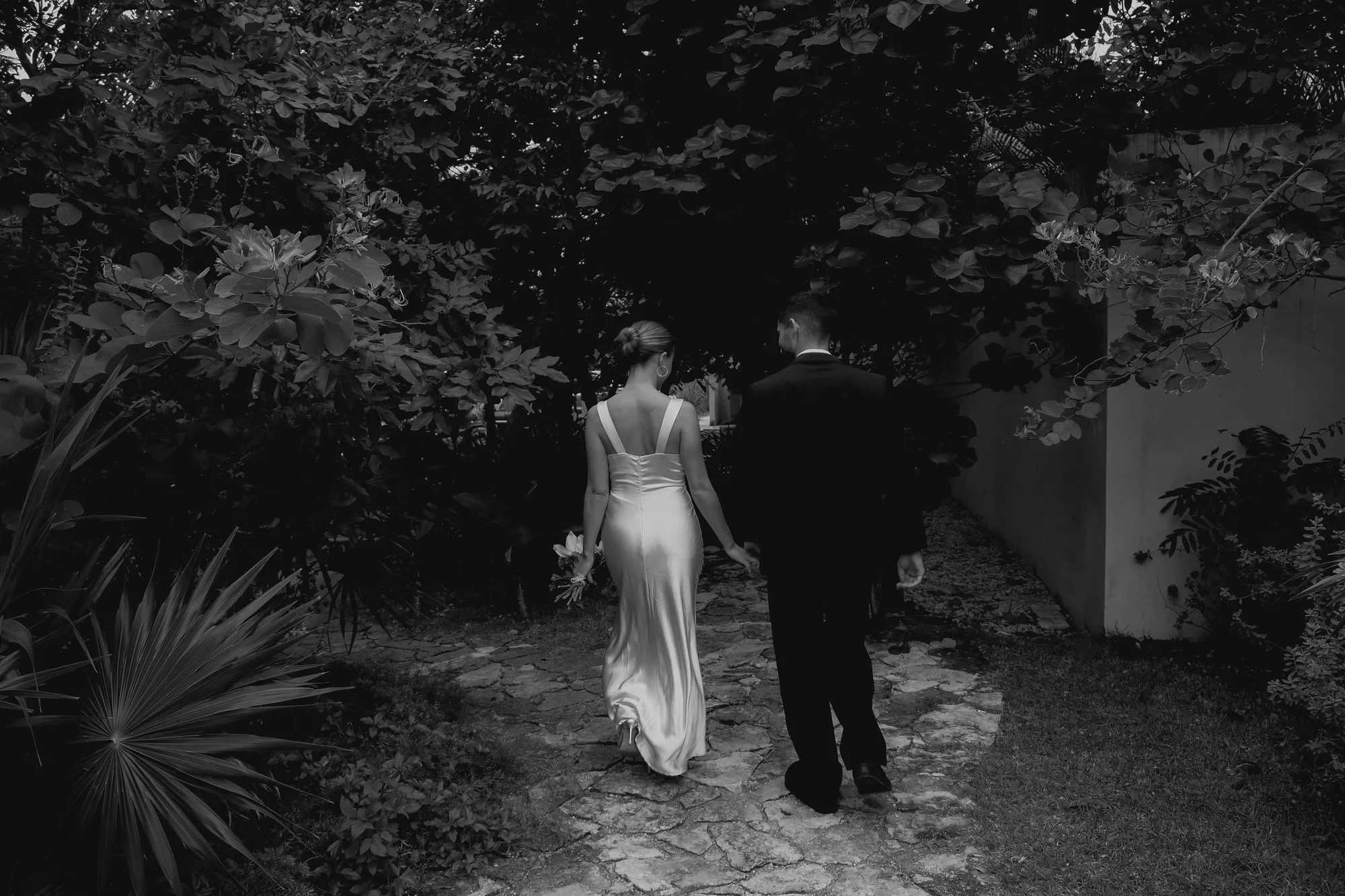 The ceremony took place in the hotel’s garden at Bacab Hotel Tulum, in front of the Gallery arch, one of the property’s most striking architectural elements. Clean lines, textured stone, and surrounding artwork created a space that felt intentional and calm, making it ideal for an intimate wedding ceremony in Mexico. No guests. No music competing with the sounds of the jungle. Just vows exchanged quietly, honestly, with hands held tight. Afterward, they lingered to take celebratory photos, sharing laughter and one deep, cinematic kiss that felt less like a performance and more like a promise of a life full of love and emotions.